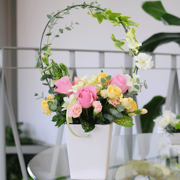 登録商品について 【商品について】 ・画像はイメージですが、ほぼ同じボリュームでのお届けになります。とても可愛らしいアレンジメントです。きっと喜ばれますね。 【サイズは?】 ・高さ40cm前後 幅30cm前後になります。 【ギフトメッセージ】・お花にメッセージを添えてお届けしますと、さらに気持ちが伝わります。もちろん無料でお付けいたしますので購入画面にてご記入ください。【送料他】 ・送料は説明文に